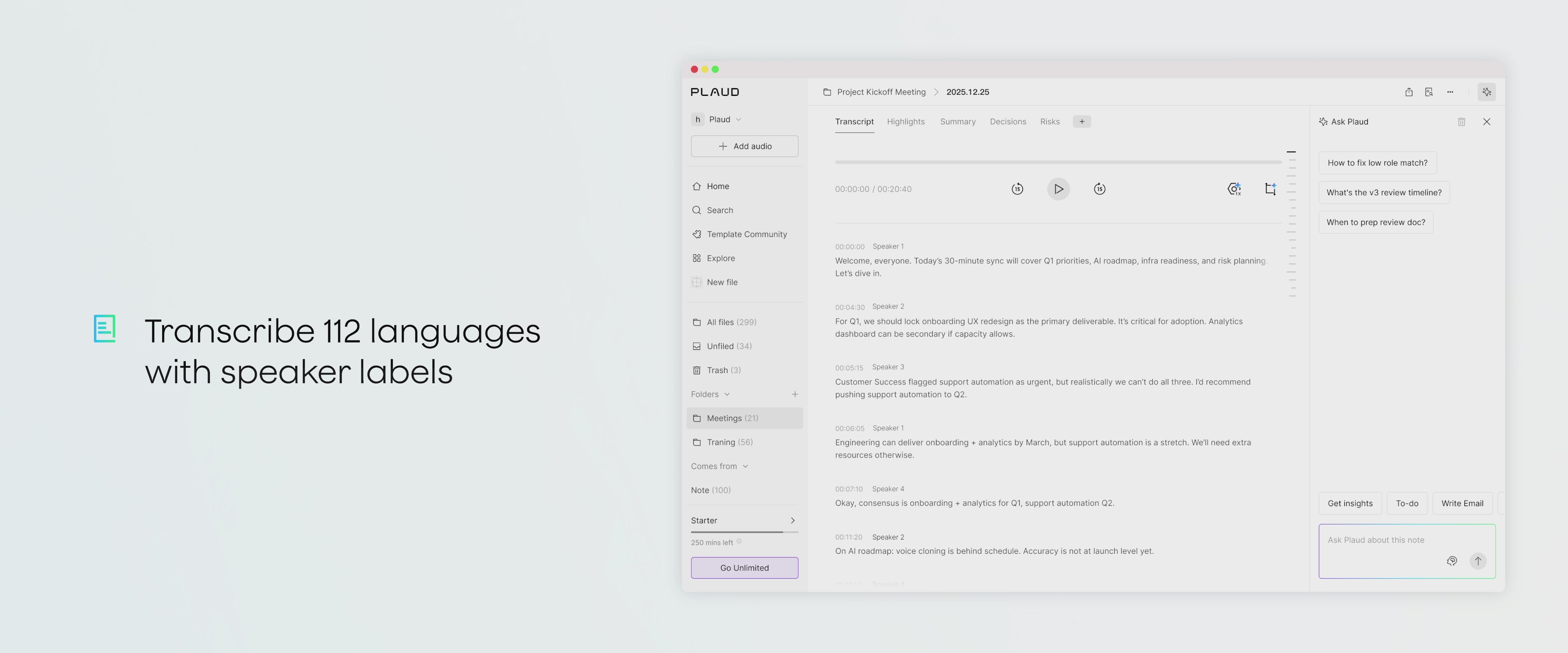 Plaud delivers precise transcriptions in 112 languages, with speaker labels and custom vocabulary tuned to your industry.